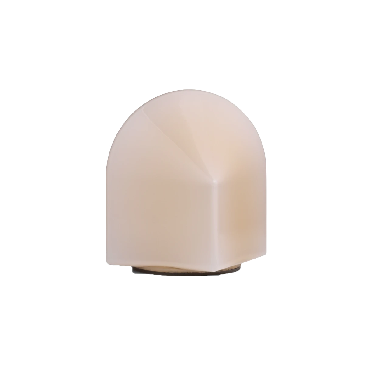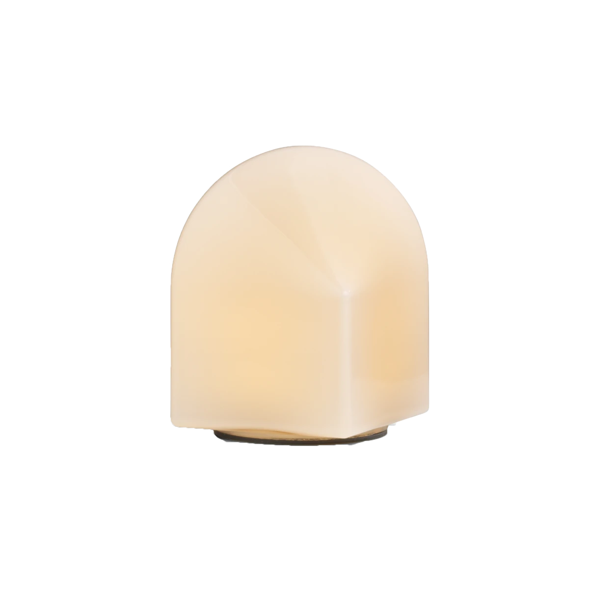 Consisting of a square base and arched top in coloured glass, the geometric shape causes the expression to change depending on whichever angle the lamp is turned.